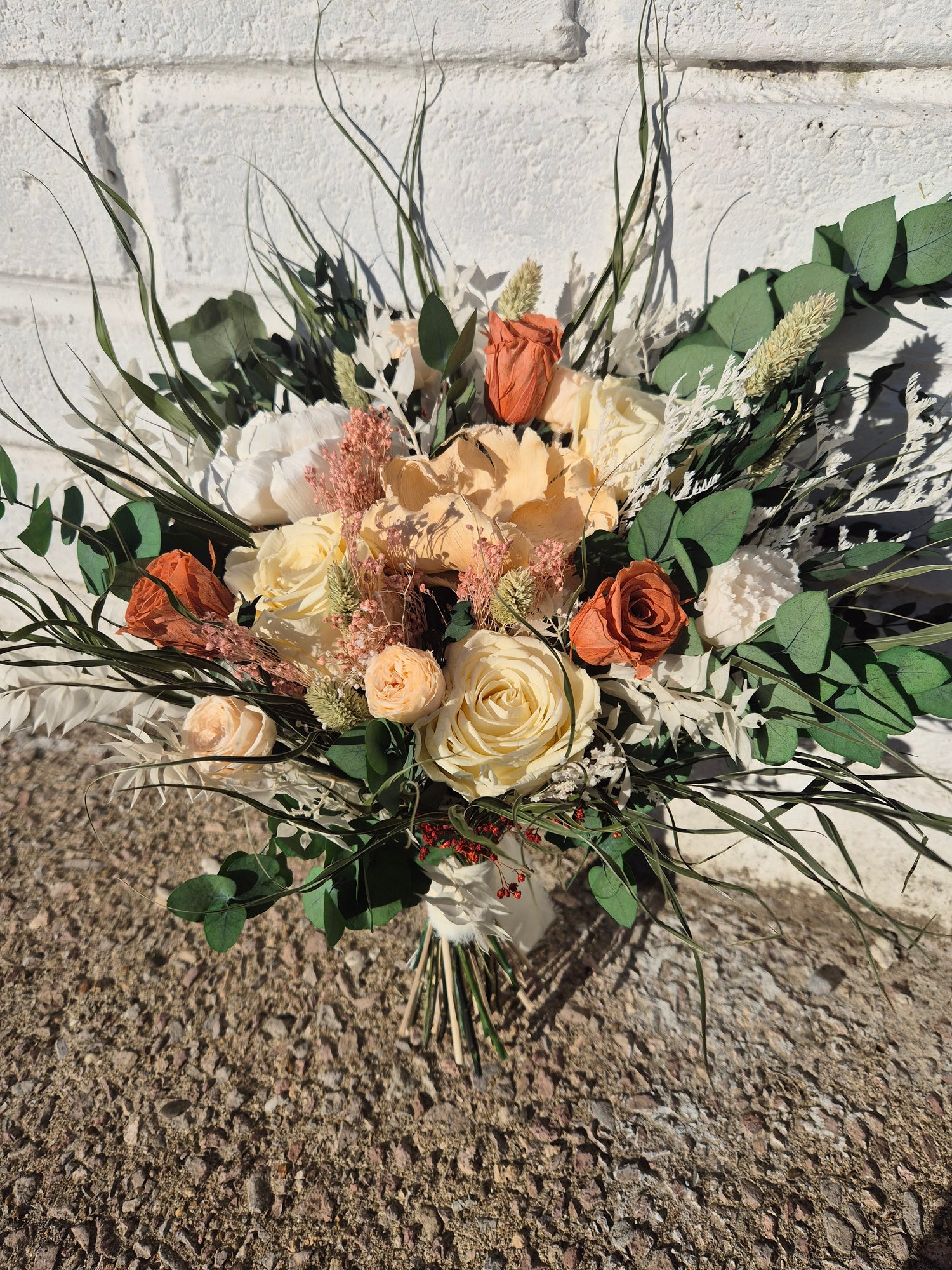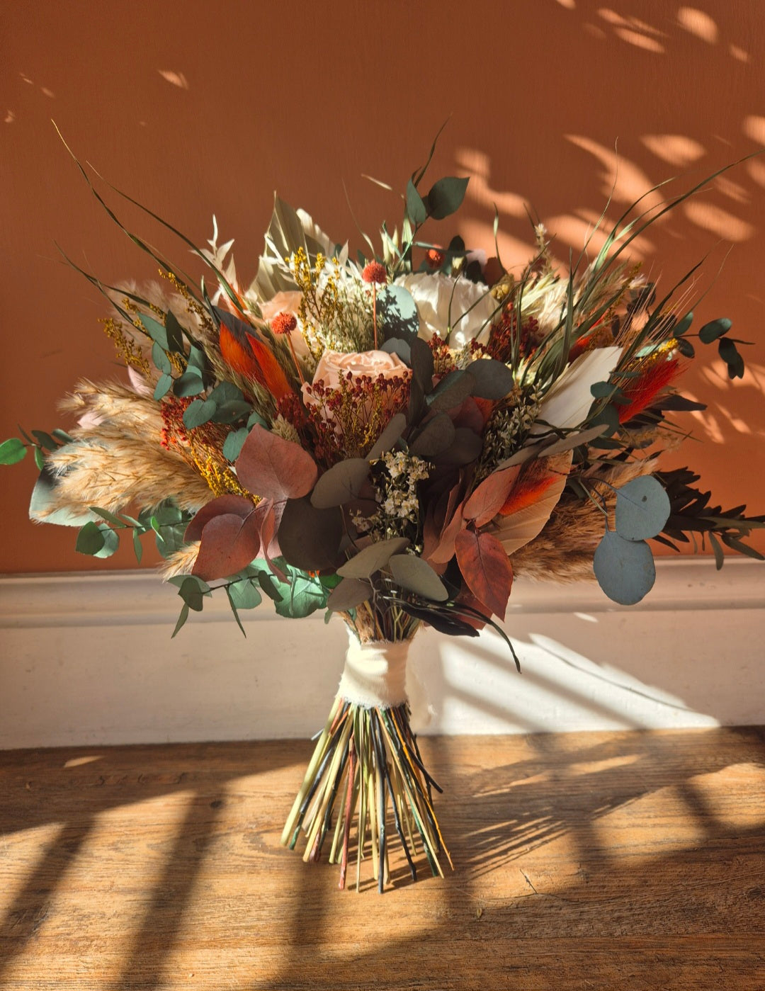 The brief was autumnal and something she would be proud to hold on the day! With preserved flowers and foliage including mocha roses, burnt orange hydrangea and evergreen eucalyptus, this bouquet was simply stunning and perfectly represented a warm autumns day.