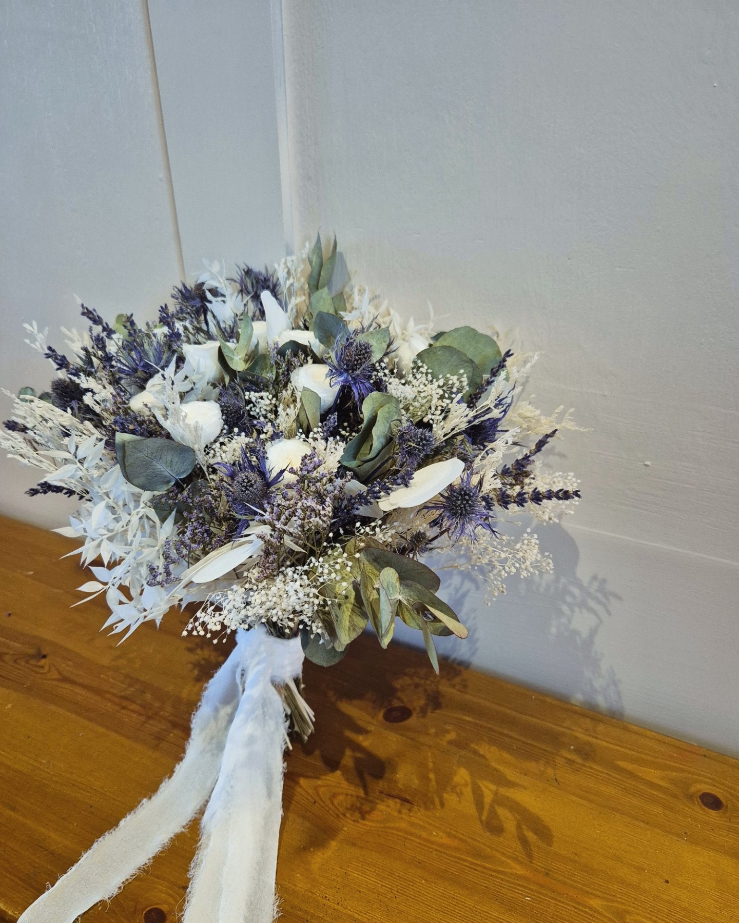 A delicate, soft palette of pink, blue, white and green perfectly combined to showcase the beauty of preserved and dried flowers. This bouquet was matched with smaller versions for the buttonholes, showing intentionality and connection between bride and groom.