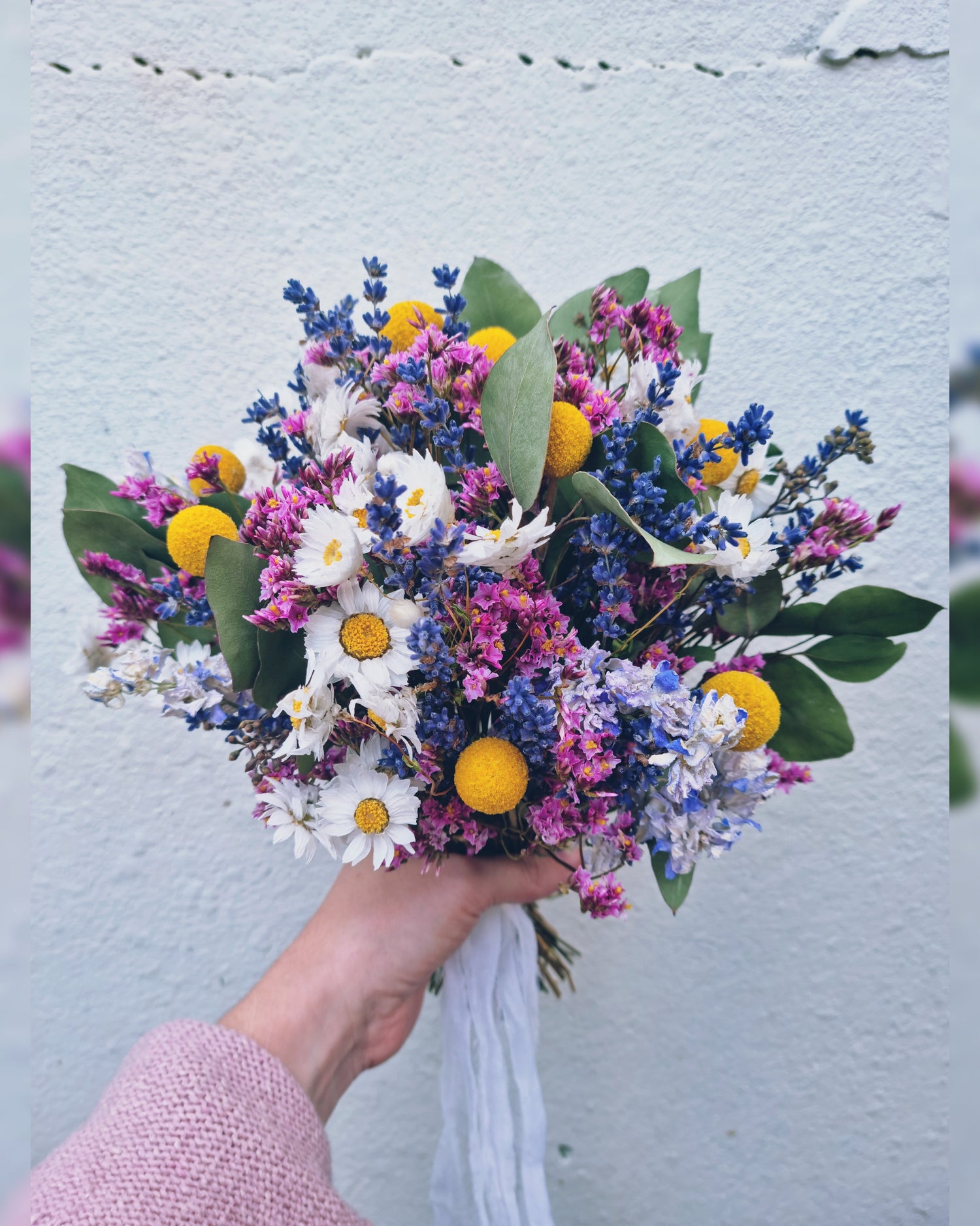 A wild, handpicked bouquet with dried daisies and gypsophila at the heart, perfectly accentuated with pops of blue and yellow from the lavender and billy buttons.