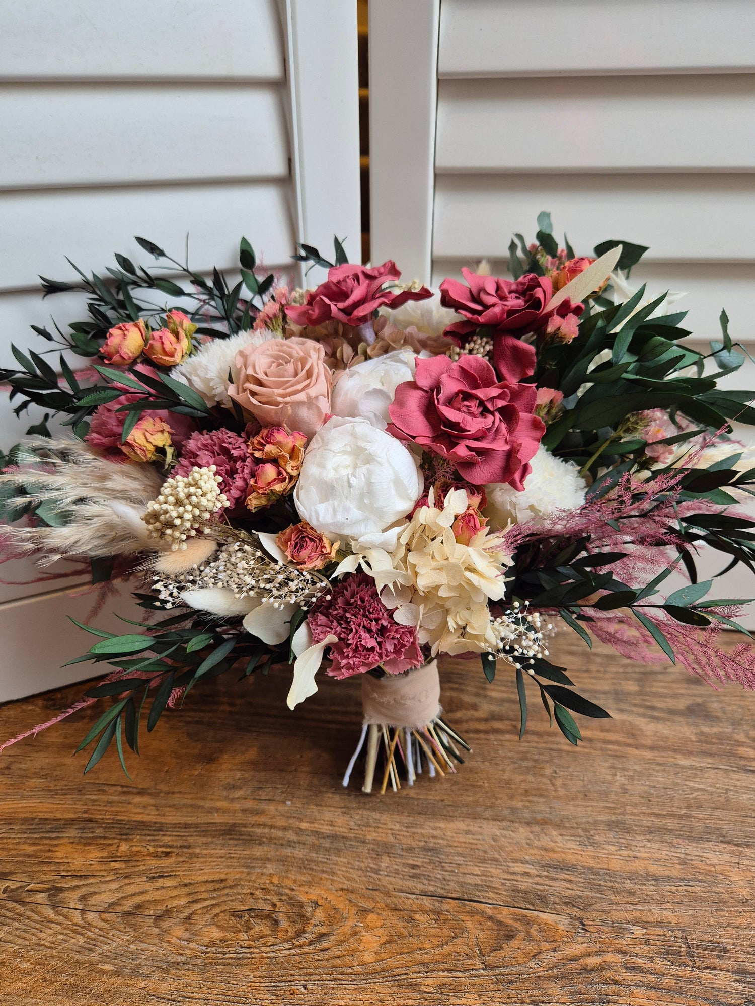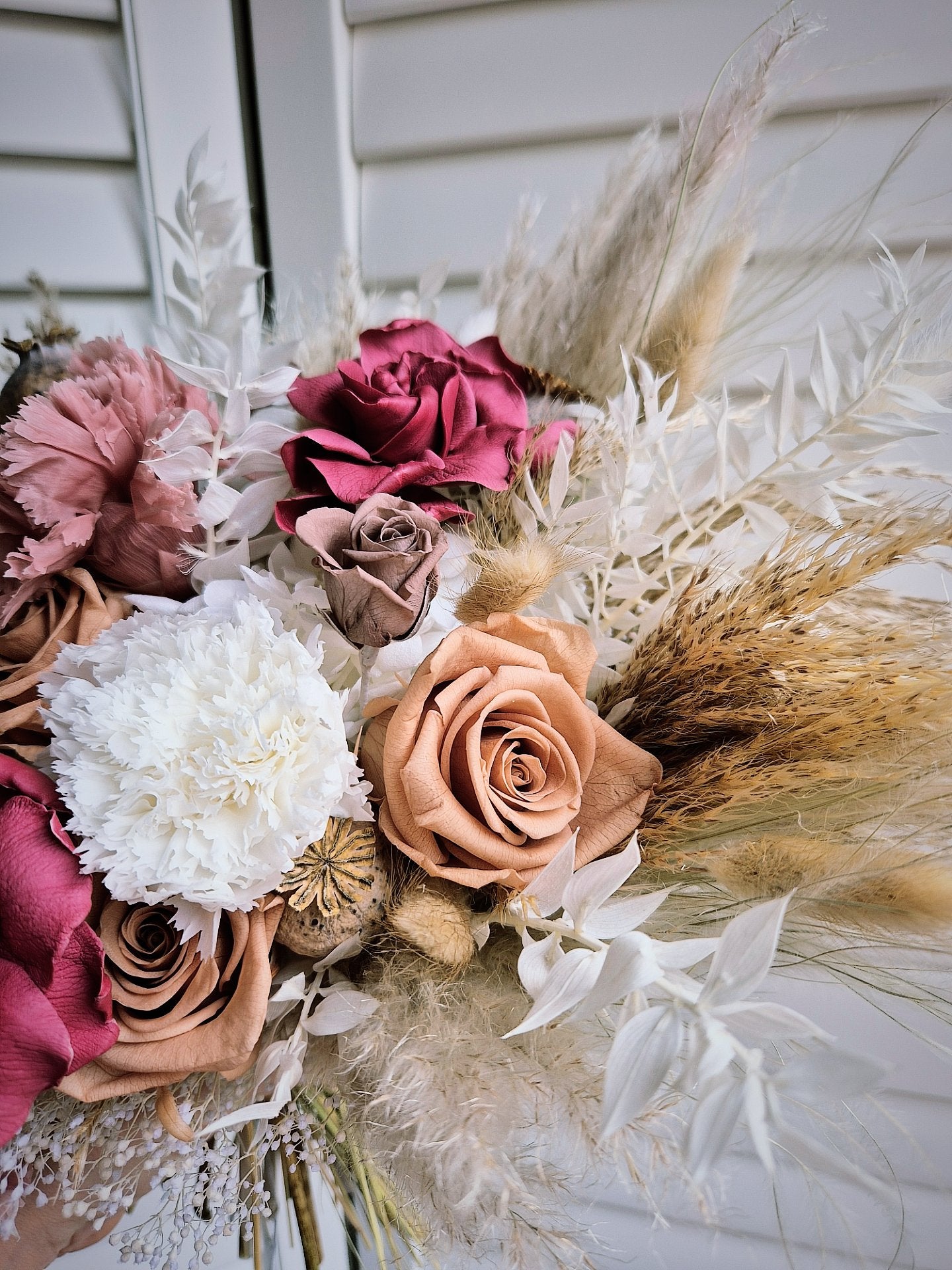A bountiful, beautiful preserved flower bouquet for Becca's stunning summer wedding. Full with preserved roses, hydrangeas, eucalyptus and billy buttons. A showstopper to take center stage with the bride, and to keep for years to come.